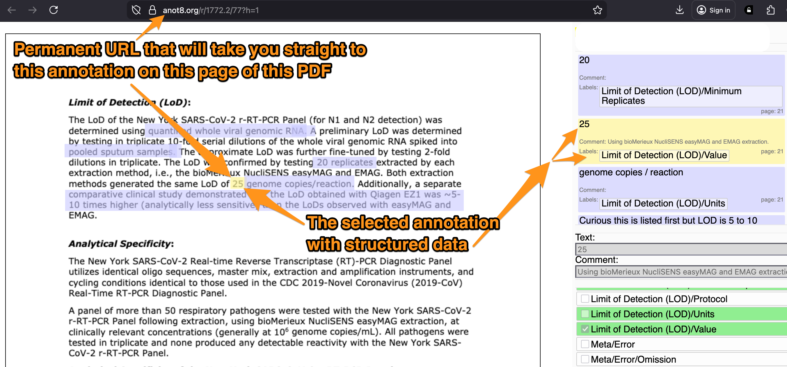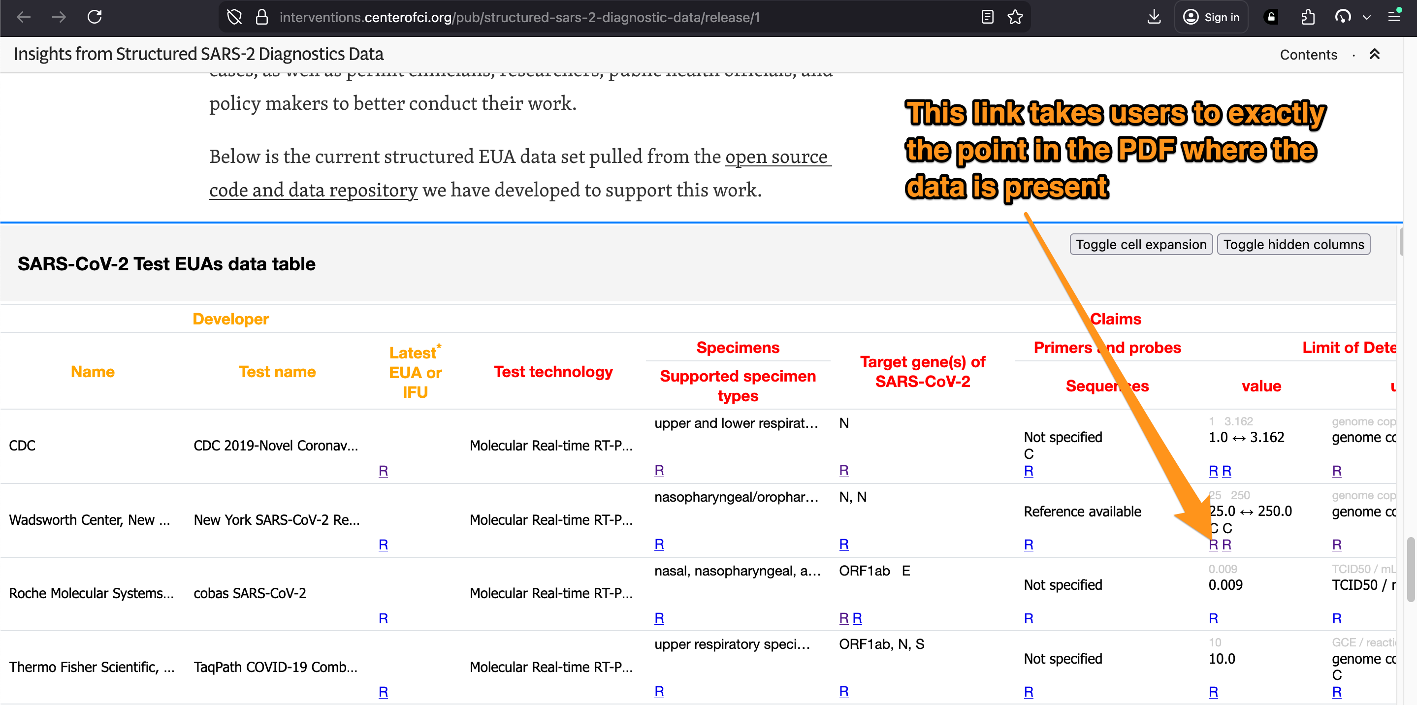 After this labelling was performed it was now trivial to both link to, recall, validate and analyse these structured data annotations. As shown in the table "SARS-CoV-2 Test EUAs data table" in this write up Insights from Structured SARS-2 Diagnostics Data, every single value that makes up each cell (sometimes multiple values) is referenced to a specific point in each PDF. For example that screenshot above comes from clicking this link in the table: