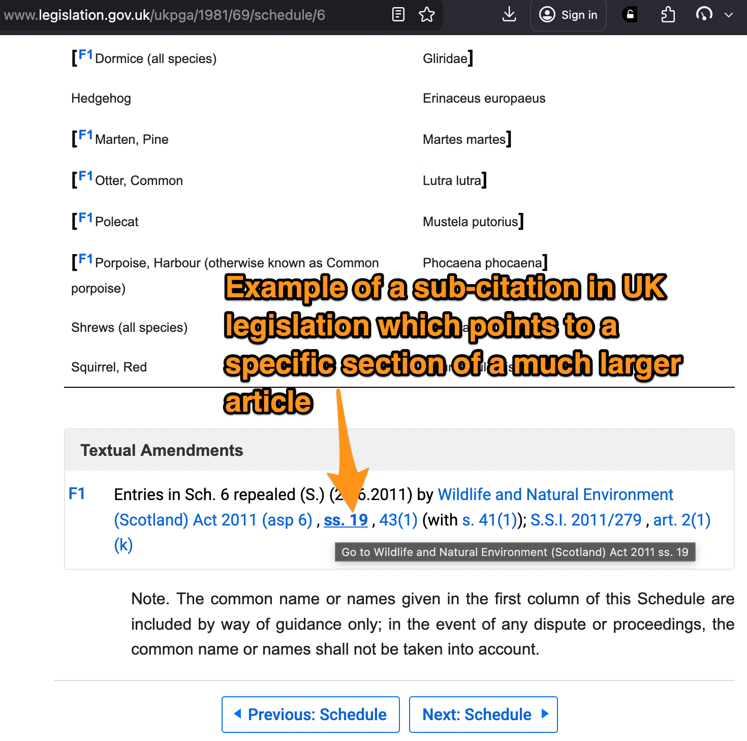 Referenced legislation (which happens to be a fairly decent sub-citation by itself but with the Text Fragments supported by Firefox browsers this highlighting function is very good, and if it automatically scrolled the page to the highlighted text, it would be spot on! legislation.gov.uk/ukpga/1981/69/schedule/6#:~:text=ss.%2019)